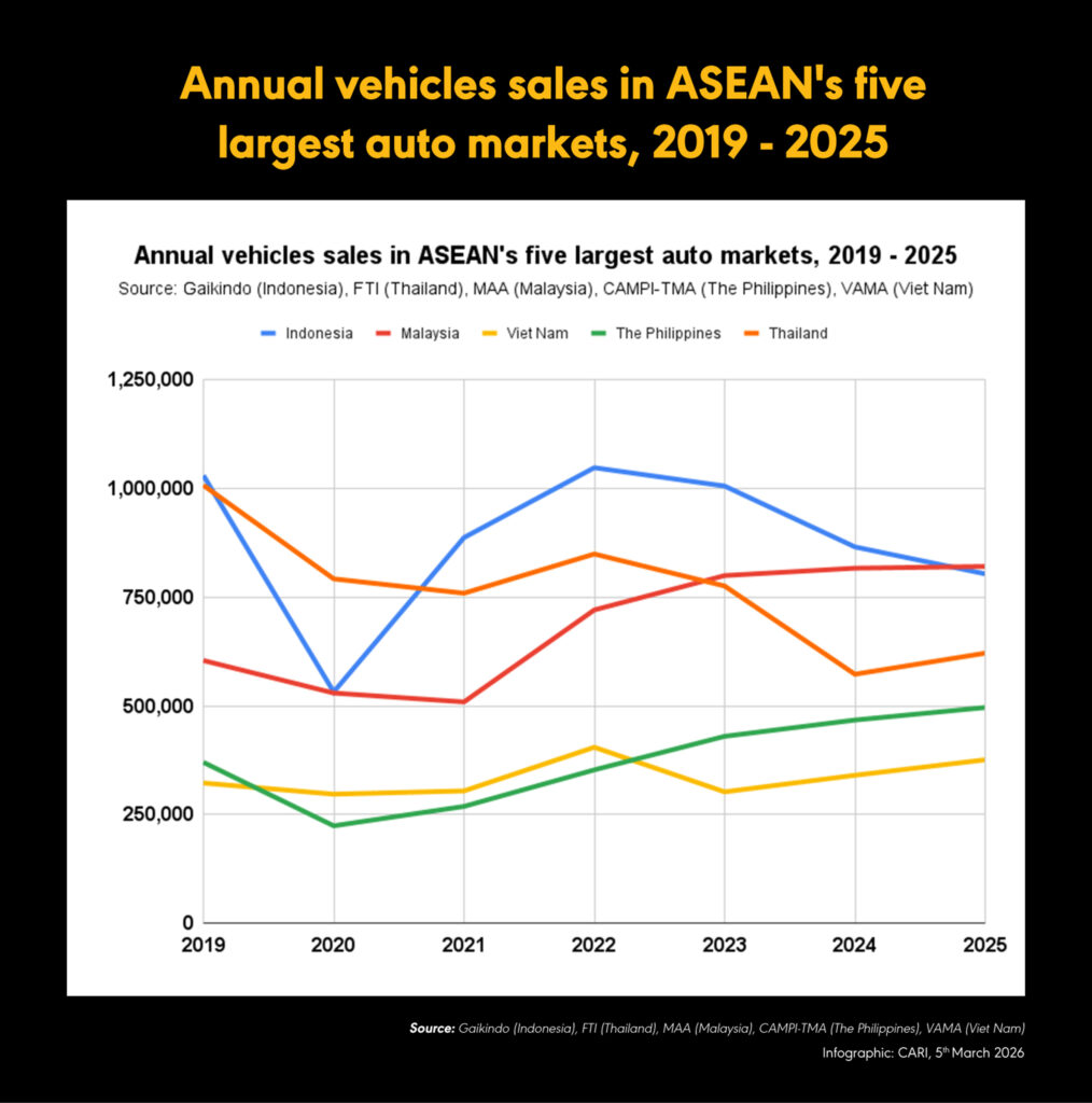(28 February 2026) Malaysia became Southeast Asia’s largest auto market in 2025 with 820,752 vehicle sales, up 0.5% year-on-year, surpassing Indonesia’s 803,687 units, which fell 7.2%, marking the first change in regional leadership since 2014. Data compiled by Nikkei Asia across five markets show Malaysia’s sales have risen 61% from 508,883 units in 2020, compared with contractions of 23% in Indonesia and 27% in Thailand over the same period. The president of the Malaysian Automotive Association attributed performance to resilient domestic demand and favourable financing conditions. SUV sales in Malaysia rose 13% to 228,572 units, and combined hybrid and battery EV sales increased 52%, with EVs accounting for 8.45% of the market, supported by Proton’s e.MAS 5 launch. Indonesia exceeded its 780,000-unit target despite decline, with 2022 and 2023 sales previously above one million units, supported in 2025 by EV tax incentives. In Vietnam, VinFast sold 175,000 units, nearly doubling year-on-year, contributing to Vietnam overtaking the Philippines as the region’s fourth-largest market when combined with broader data, although VinFast posted a net loss of VND 24 trillion in the third quarter. In Singapore, BYD led overall sales with 11,184 units and a 21.2% share out of 52,678 registrations, with EVs representing 45% of new cars sold and supported by 28,000 charging points and incentives offering a 45% rebate on additional registration fees. Thailand showed recovery signs, with January 2026 sales rising 54% year-on-year to 73,936 units, and the Federation of Thai Industries forecasting 1.5 million units of production in 2026, up 3%.