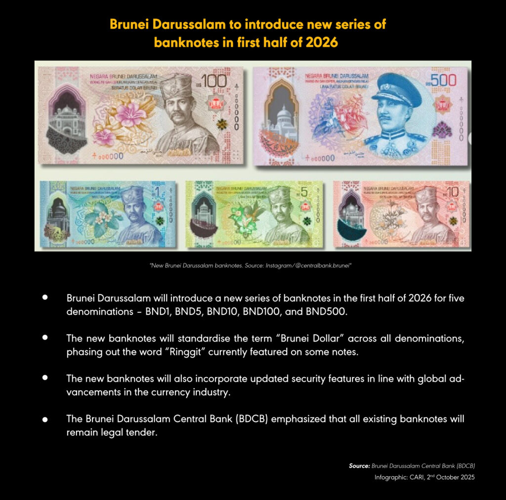 (22 September 2025) Brunei Darussalam Central Bank (BDCB) announced that a new family of banknotes will be introduced in the first half of next year, standardising the use of “Brunei Dollars” in place of “Ringgit” in line with the Currency Order 2004. The series will include five denominations — BND1, BND5, BND10, BND100 and BND500. BDCB stated that the banknotes will carry enhanced security features to strengthen protection against counterfeiting and to align with international standards in currency technology. The central bank emphasised that the initiative ensures currency integrity while supporting Brunei Darussalam’s gradual transition towards a digital economy. It added that all current banknotes will remain legal tender and circulate alongside the new series.