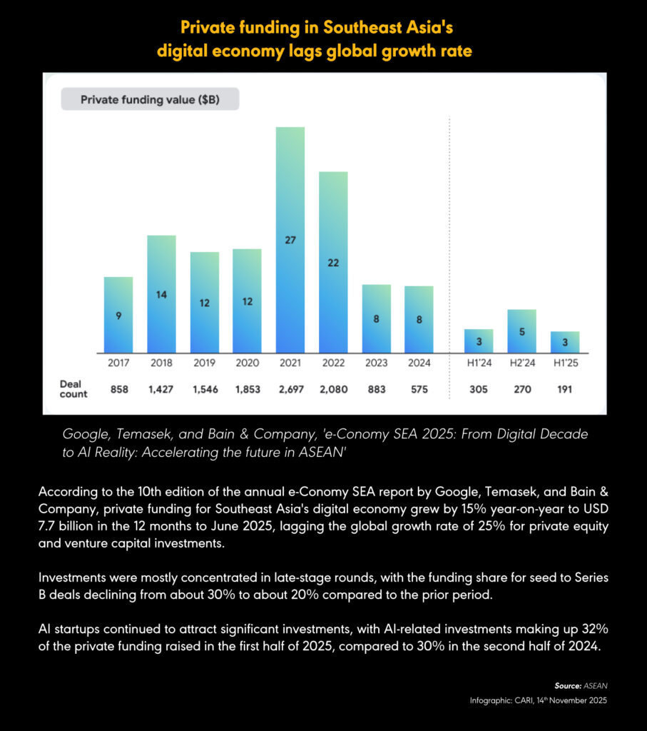 (11 November 2025) Private funding for Southeast Asia’s internet economy increased 15% year-on-year to USD 7.7 billion in the 12 months to June 2025, remaining about 70% below the 2021 peak of USD 27 billion and below the global private equity and venture capital growth rate of 25%, according to a report by Google, Temasek, and Bain. The report noted a shift toward late-stage investments, with seed-to-Series B funding falling from roughly 30% to about 20% over the period. For the first time, the report expanded its market coverage to include Brunei Darussalam, Cambodia, Lao PDR, and Myanmar. AI-related funding accounted for 32% of private capital raised in the first half of 2025 versus 30% in the second half of 2024, with over 680 AI startups securing more than USD 2.3 billion in the year to June, including more than 495 based in Singapore. The report highlighted accelerated data centre expansion, projecting Southeast Asia’s capacity to increase 2.8-fold once planned projects are completed, compared with 2.2-fold growth for the broader Asia-Pacific region. It cited major commitments such as TikTok’s nearly USD 4 billion data hosting plan in Thailand and further planned investments by Google and Amazon of USD 1 billion and USD 5 billion, respectively. Malaysia is expected to lead regional capacity growth with 2,415 MW of planned additions out of the region’s 4,620 MW total, supported by investments from Microsoft, Amazon, Google, Tencent, Huawei, and Alibaba, driven by favourable land and electricity costs and strong projected AI demand.