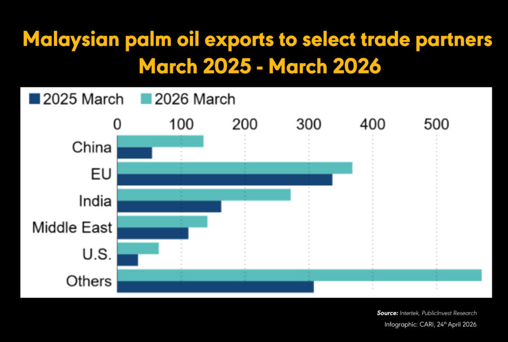 (20 April 2026) Demand for crude palm oil (CPO) has increased due to the Iran war, prompting stockpiling and lifting Malaysian and Indonesian exports to multi-month highs while raising supply concerns. CPO prices are under near-term upward pressure, supported by inventory build-ups and higher crude oil prices boosting biofuel demand. Malaysian palm oil futures reached their highest level since December 2024 in April following the conflict. Malaysia’s CPO exports rose 41% month on month in March to 1.6 million metric tons, the highest since October 2025, with strong demand from China, the Middle East, the U.S. and the EU. Exports to the Middle East surged 547.2% to 280,000 metric tons, while shipments to China and the U.S. rose 132.6% to 233,000 metric tons and 210.5% to 169,000 metric tons respectively. The EU remained the largest buyer, accounting for 23.4% or 963,000 metric tons of Malaysia’s exports from January to March 2026. Indonesia’s palm oil exports increased 36.26% year on year to 4.54 million tons in January–February. Rising fertiliser costs, up about 50% due to supply disruptions, are leading smallholders to reduce planting and fertiliser use, with potential production declines flagged by industry groups. Weather risks, including a 50%–60% probability of El Nino between July and September, could reduce fresh fruit bunch output by up to 16% and CPO production by up to 14% in subsequent years. Ageing plantations in Malaysia, with 35% of trees projected to be 19 years or older by next year, add to supply constraints. Indonesia plans to raise its biodiesel blending mandate to B50 from 01 July, potentially diverting 1.5 million tons of CPO from exports.