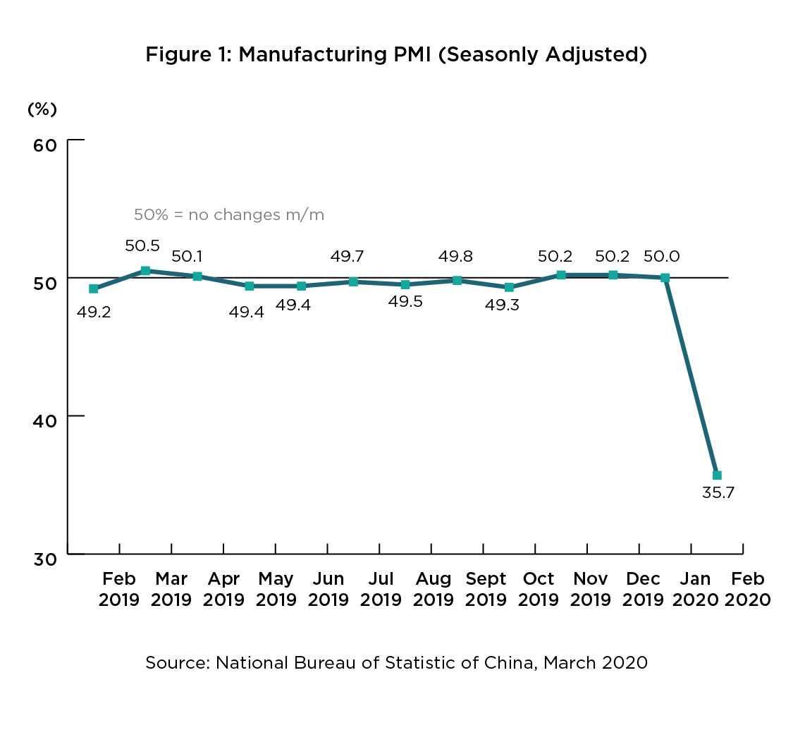 • The Manufacturing Purchasing Managers Index (PMI), a measure of factory activity across the country, plummeted to a record low of 35.7 in February 2020, down from 50.0 the month before (see Figure 1).4