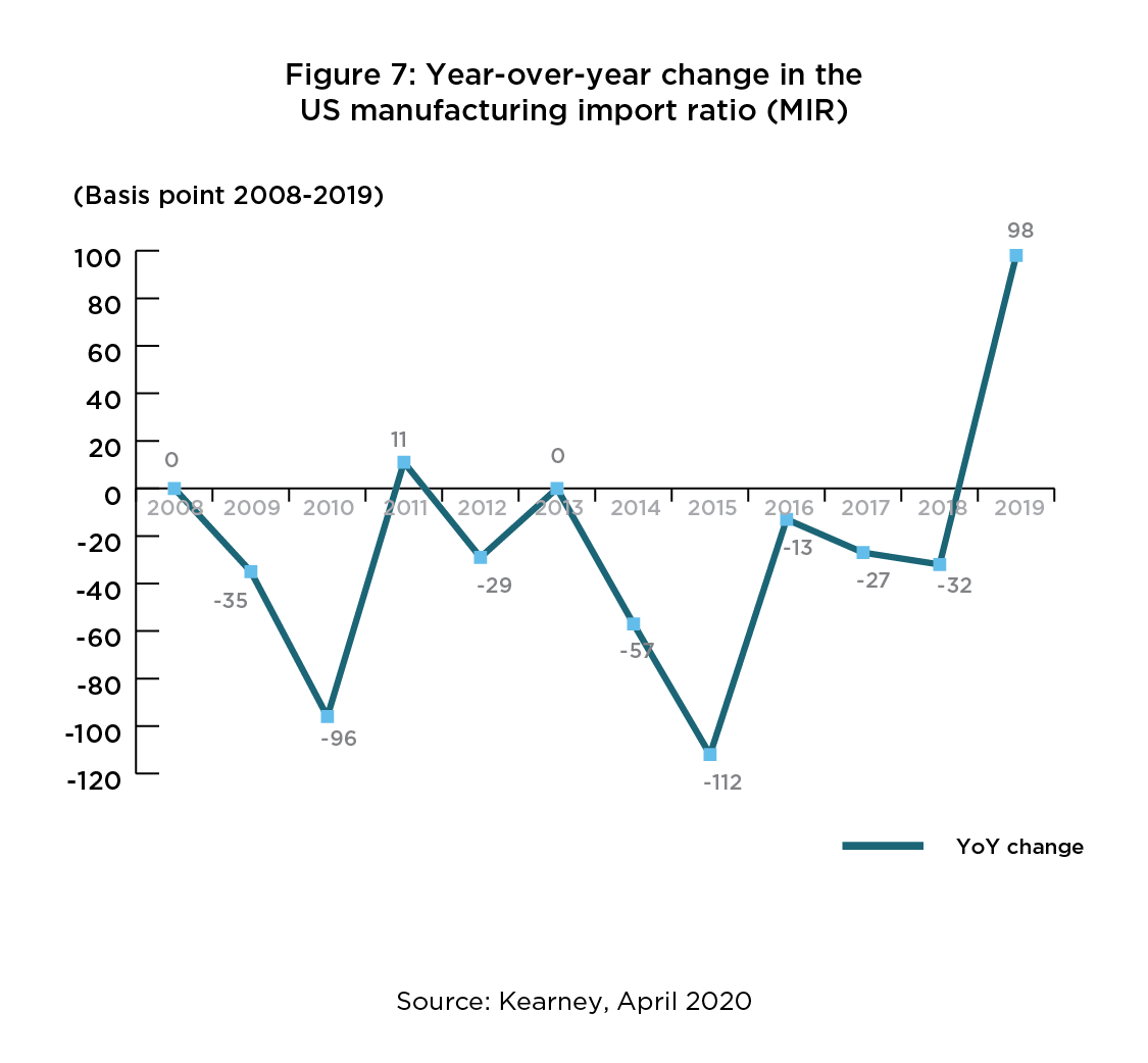 The resulting 98-basis point jump in the Kearney Reshoring Index in 2019 is by far the highest yet registered by the index (see figure 7). Kearney attributed this almost exclusively to a collapse in imports from China, which declined by 17% in value terms due to US tariffs. By a substantially increased margin, US companies chose to source more goods domestically rather than import them from the Asian LCC countries. 18