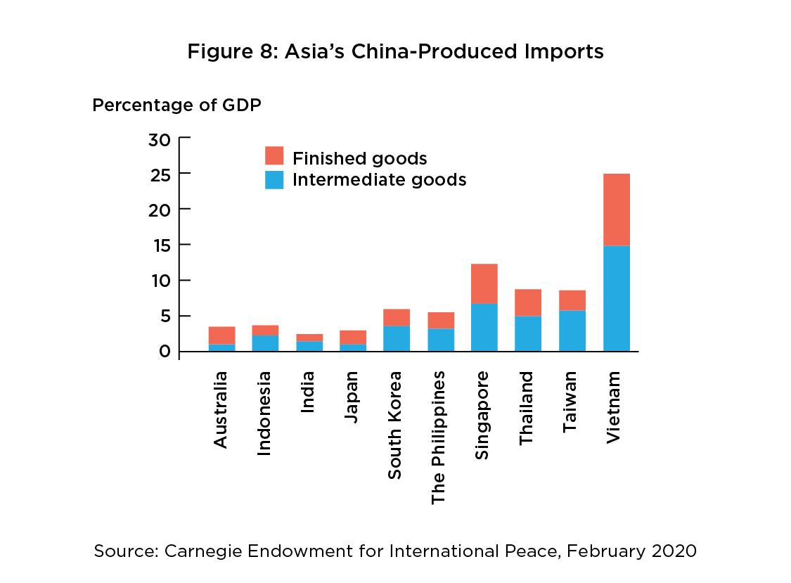 However, caution must be practised. Even if ASEAN firms were to benefit from import-substitution and production relocation vis-a-vis China, the complexity of modern supply chains means these firms may themselves may be dependent on Chinese supplies of raw materials and sub-assembly components. To put this into better perspective, data from the Carnegie Institute revealed that countries like Vietnam, Philippines, and Indonesia imported a larger proportion of Chinese-made intermediate goods than finished goods (see Figure 8). Most multinational corporations (MNCs) today are often unaware of the full extent of their supply chains below their top tier (direct) suppliers. 20