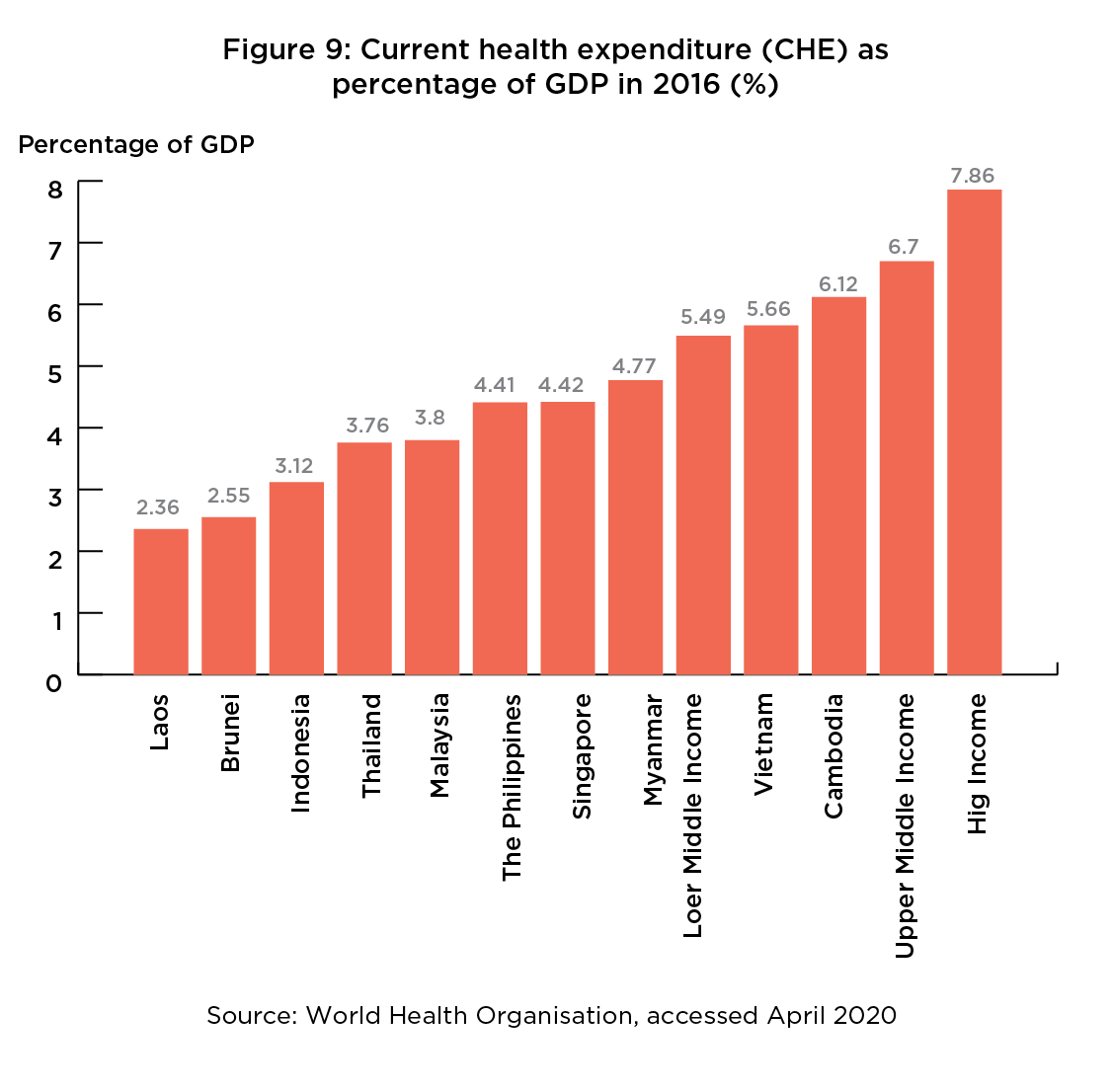 Figures from the World Health Organisation are revealing: the majority of ASEAN Member States with the exception of Vietnam and Cambodia allocated a smaller proportion of their resources towards healthcare compared to the average for lower middle income countries (as defined by the World Bank), and ASEAN collectively allocated lower amounts than upper middle income countries (see Figure 9). This would indicate a lack of focus on public health for many ASEAN countries, which may change post-pandemic.22